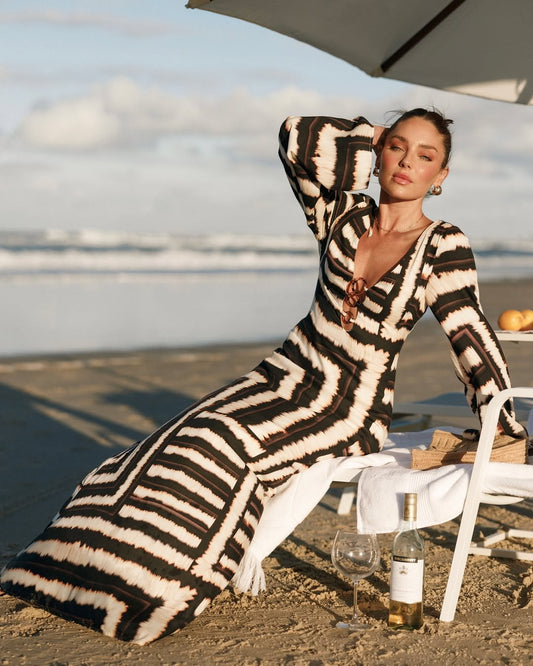 Crafted in a hypnotic mocha–cream–black ikat print, Mocha Mirage Maxi Dress captures the glow of golden hour. A deep V-neck framed by glossy tortoise rings, billowed long sleeves, and an open-back tie create a fluid, sculptural silhouette that moves with you — from beachside escapes to evening soirées.