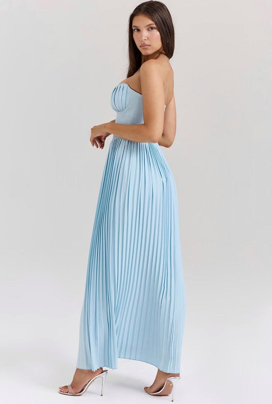 Turn heads with the Florian Rochas | Sky Grace Pleated Maxi Dress, a stunning blend of timeless elegance and modern femininity. Designed with a structured, bustier-style bodice and flowing knife-pleated skirt, this dress moves beautifully with every step. Perfect for weddings, evening events, vacations, or a chic summer soirée, it radiates confidence and grace.