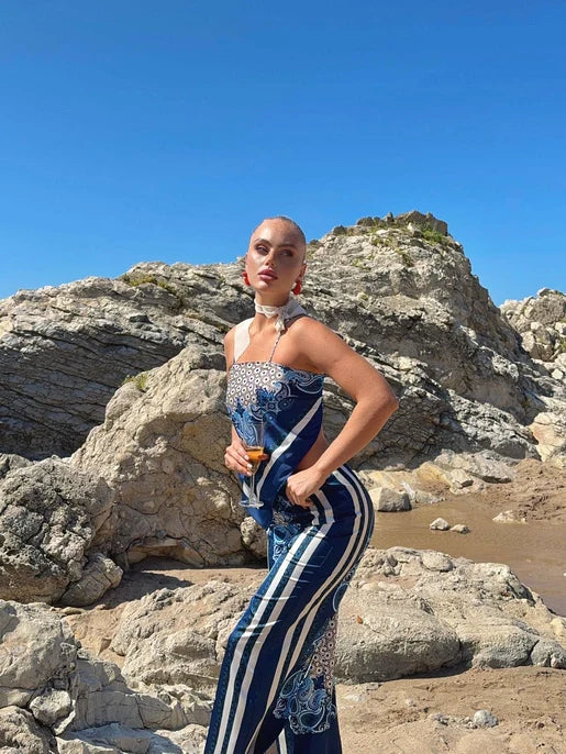 The Midnight Mirage Suit by Florian Rochas combines striking patterns with a flattering silhouette. Its rich navy tones and bold prints create a timeless look, making it the perfect choice for spring, summer, and autumn. Whether you’re strolling through the city, enjoying a holiday, or heading to a night out, this suit delivers both comfort and elegance.